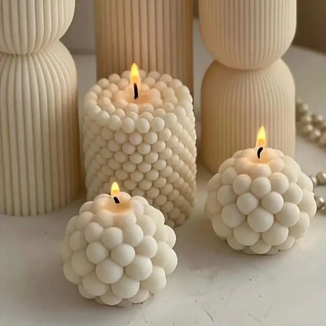 Elevate your space with our enchanting trio! This set includes 1 Bubble Bliss Cylinder Sizes (7.5 cm x 6.5 cm) and 2 Bubble Pop Spheres (6 cm x 5 cm) Material: Natural soy candle Scent: