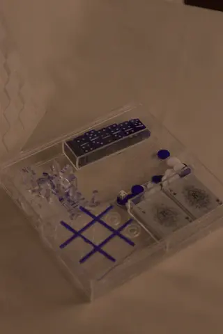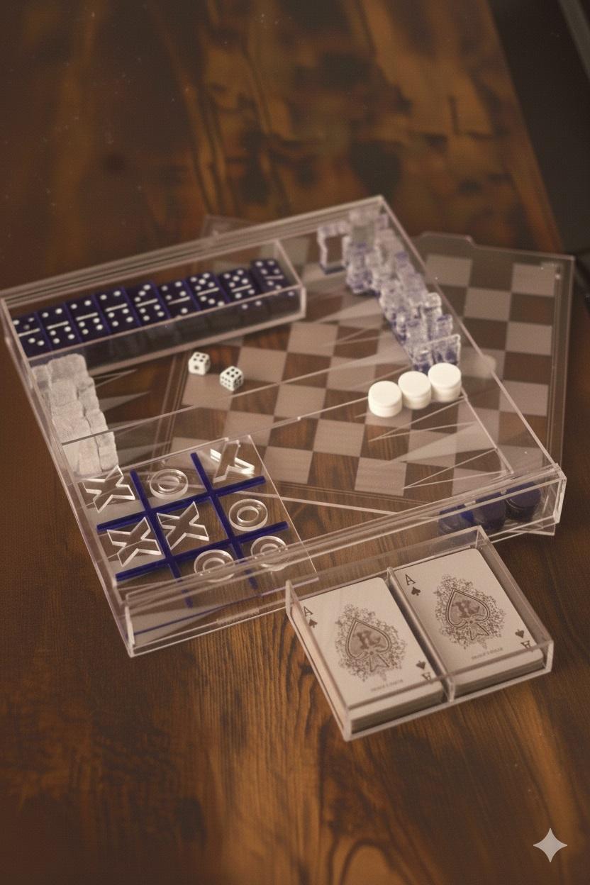 Discover the ultimate 5-in-1 acrylic game box, a compact and elegant solution for stylish entertainment. Crafted from premium acrylic in a chic white and blue colorway, this multi-game set includes all your favorite classics: chess, backgammon, dominoes, playing cards, and tic-tac-toe, all neatly arranged in one sleek box.