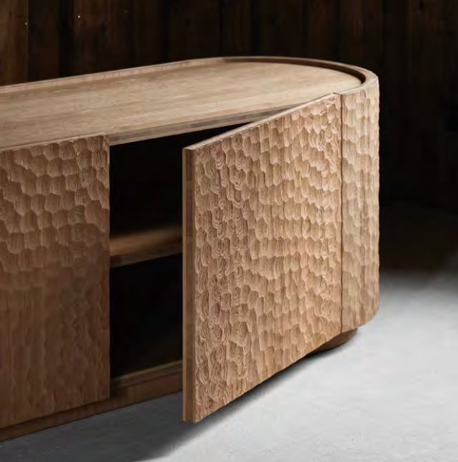 Inspired by African wood crafts, this sideboard is one of a kind both in terms of design and its hand-carved texture which is cut into solid oak.
