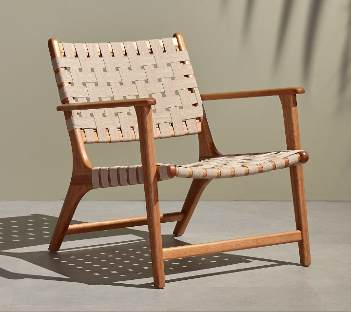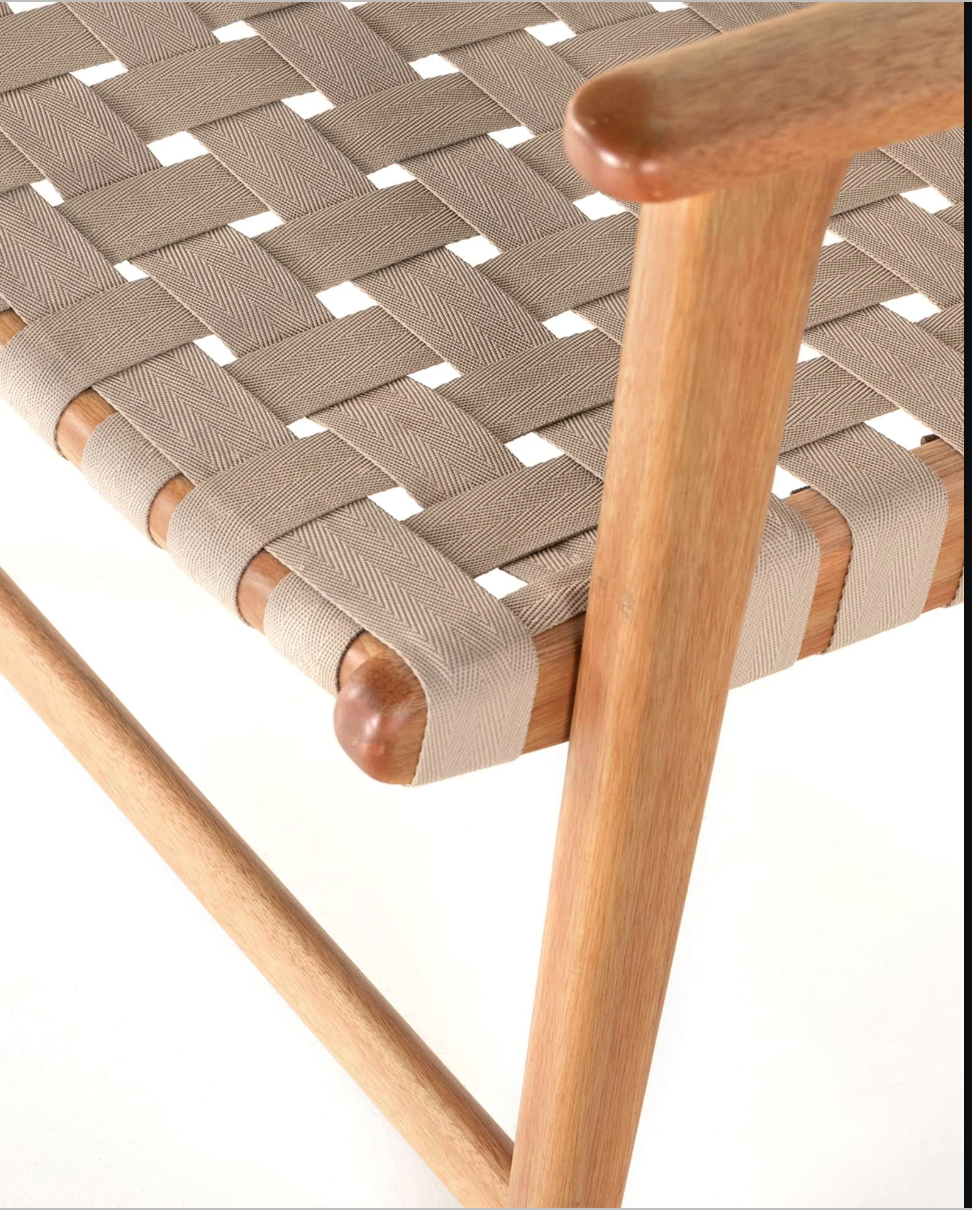 The Almira is a gorgeous armchair, both visually appealing and comfortable, thanks to its smooth shape and the combination of bleached beech with cotton-linen belts. The Almira will surely become your favorite outdoor piece.
