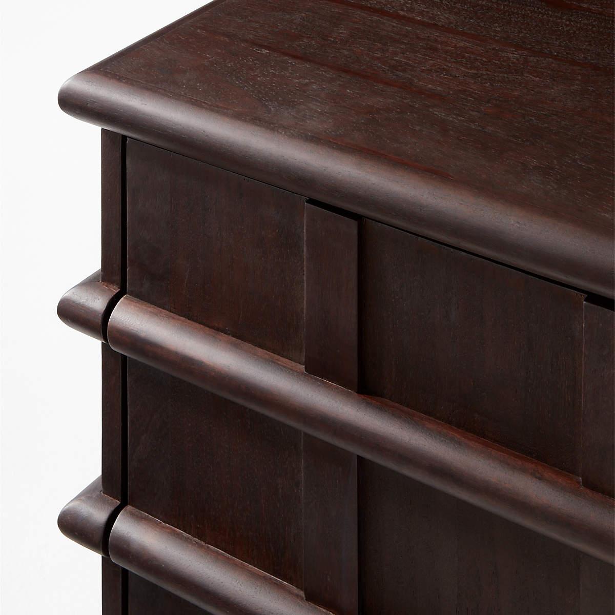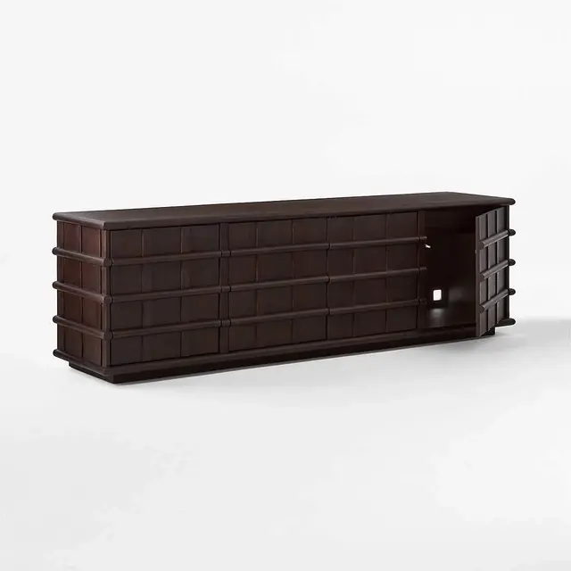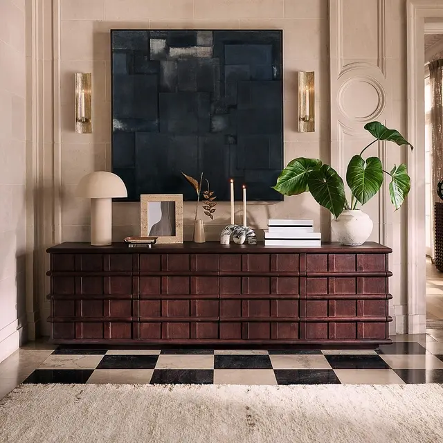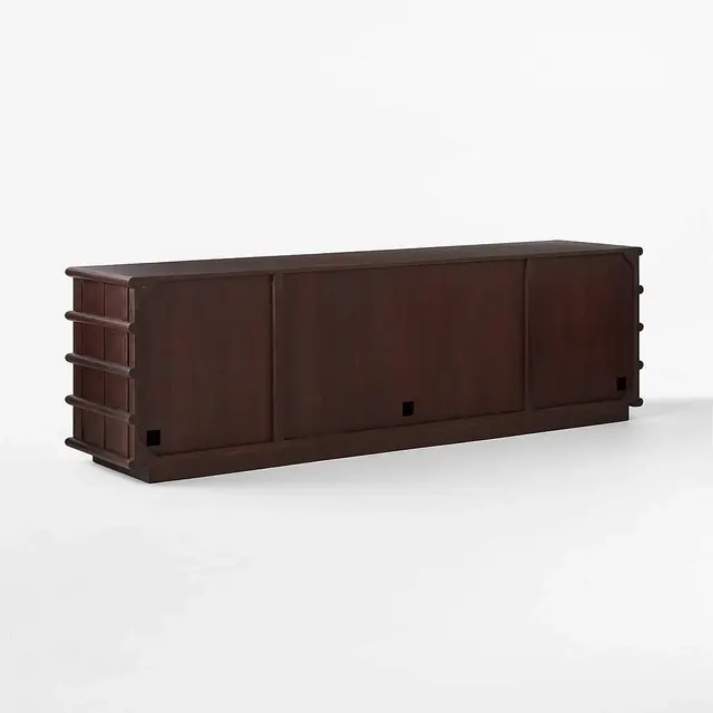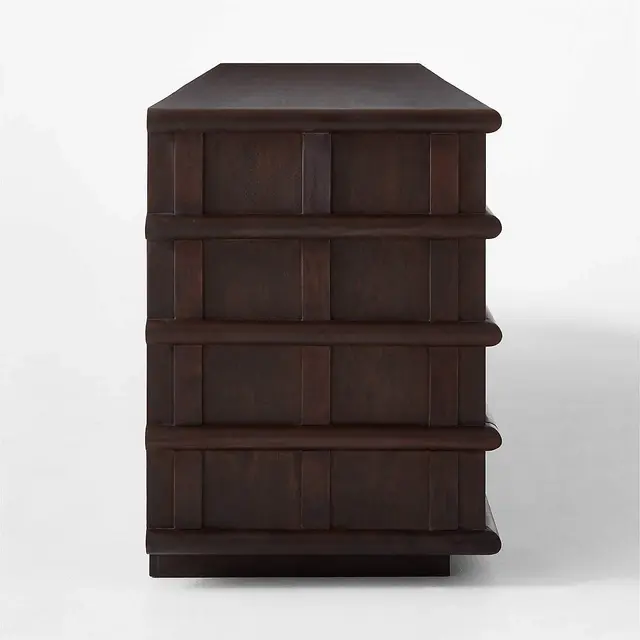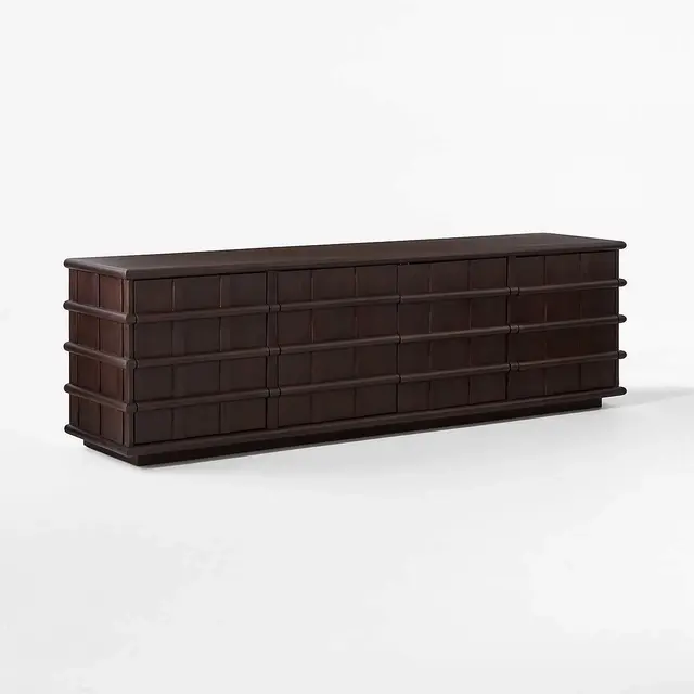 Acacia wood credenza by Evan Jerry elevates the dining room on a bold scale. The gridwork of wood on the door fronts lends an artisan appeal, while the dark brown stain enhances the wood's unique grain and natural character. Four push-to-open doors reveal adjustable shelves and two drawers to store flatware and linens.