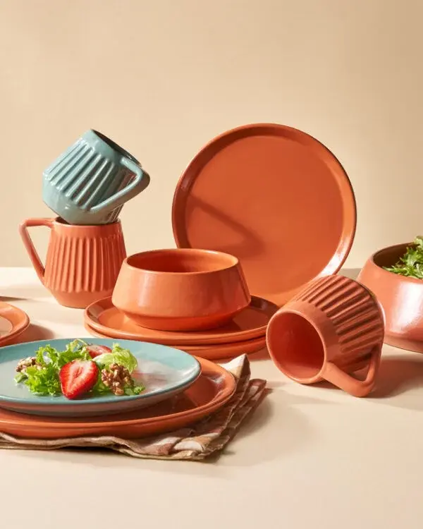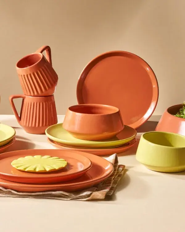 The sleek lines and dynamic design of the ‘Arki’ plates are meticulously crafted to elevate your dining experience. Some plates within the collection boast vibrant, popping colors on their inner surfaces, juxtaposed against the outer face in the same unique shade, creating a striking contrast that truly stands out.