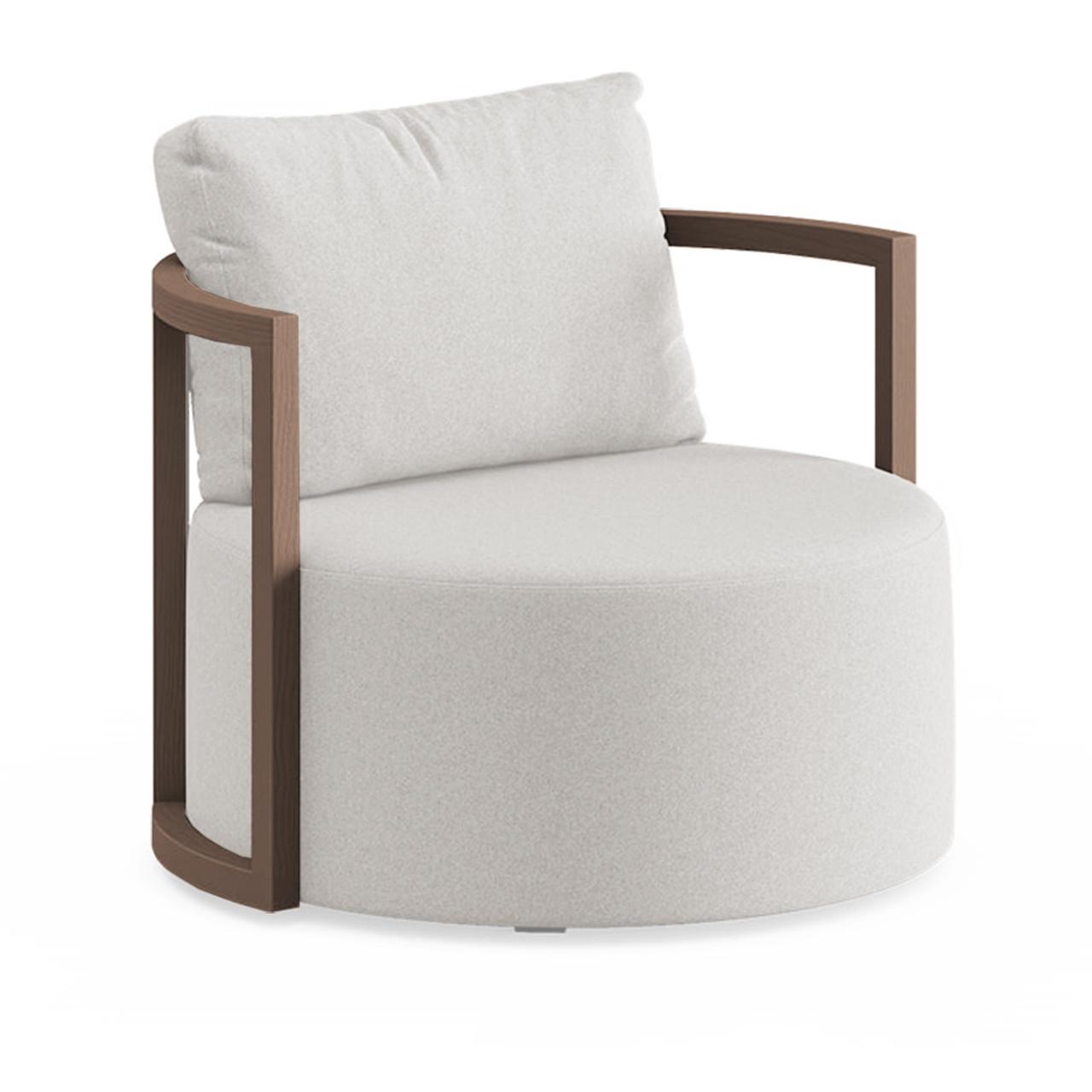 Its gently curved barrel back flows effortlessly into the armrests, embracing the sitter in ergonomic harmony. A padded seat and back cushion mirror the chair’s graceful profile, upholstered with tailored precision for a refined, uninterrupted finish.