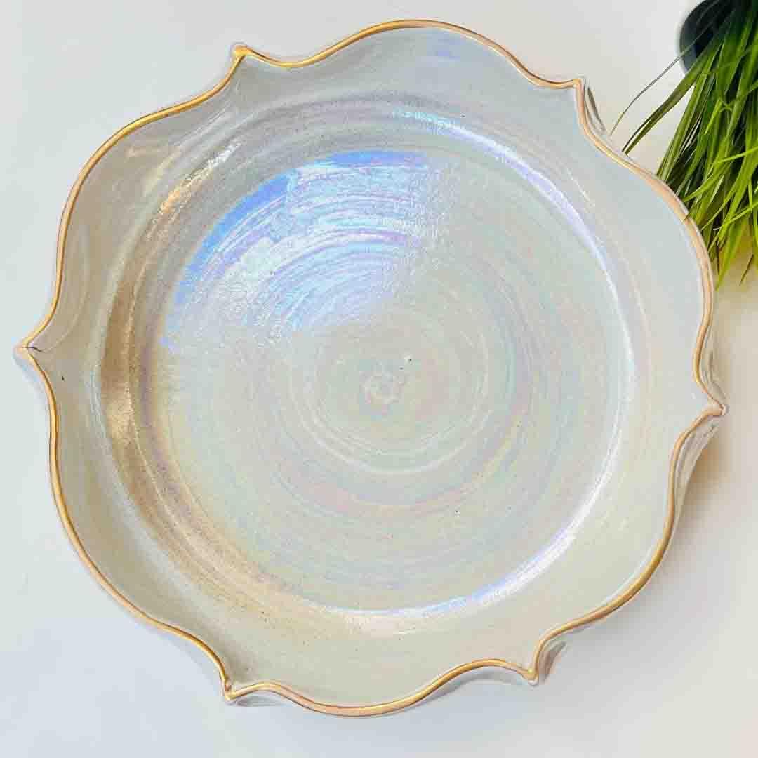 Long Description: Serving pasta deep Platter 35cm with Gold extract on the rim Material: Pottery. Color: Pearly Off-white, Rainbow Mint, Olives, Earthy Rose, Sky Blue, Light Gray Care Instructions: Oven Safe.