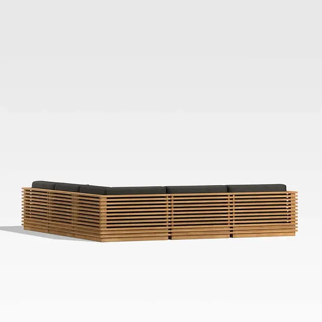 Modern, modular and made for the outdoors, our Batten sectional riffs on our popular indoor storage and bed collection to outfit your alfresco living space with clean lines and real teak. The bold slats of sustainable teak that define the linear profile and minimalist silhouette of the components—right- and left-arm chair, two armless chairs and corner—line up seamlessly to form the L-shaped sectional. Layered with charcoal grey seat, back, lumbar and throw cushions covered in UV-resistant olefin, the five-piece sectional sits deep and comfortable day into night.