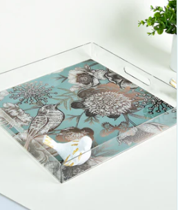 Acrylic tray 30x30 cm with handmade bird ornament and bird & flower artwork in gold tones.