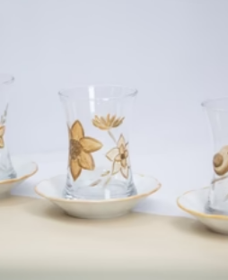 Set of 6 hand-painted tea cups with matching saucers. Bird & flower motif with gold accents.