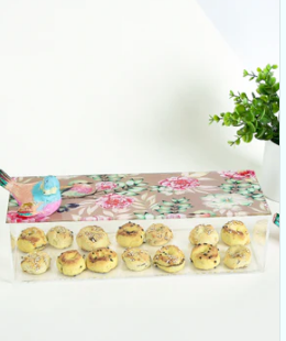 Acrylic long box 30x10 cm with pink bird & floral motif lid and a handmade bird ornament.