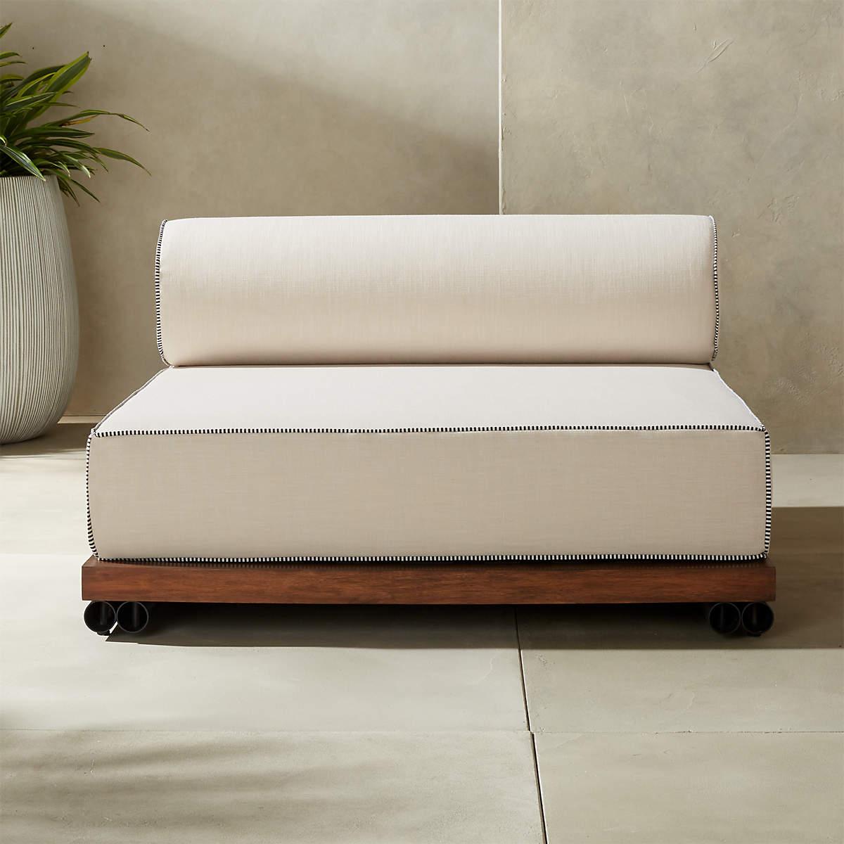 Matte black aluminum pipe frame, midtone mahogany platform and cushion for days. Brett Beldock's low-profile outdoor armless chair is made for lounging. Chic down to the details with black and white striped piping and a round back pillow. We're in love.