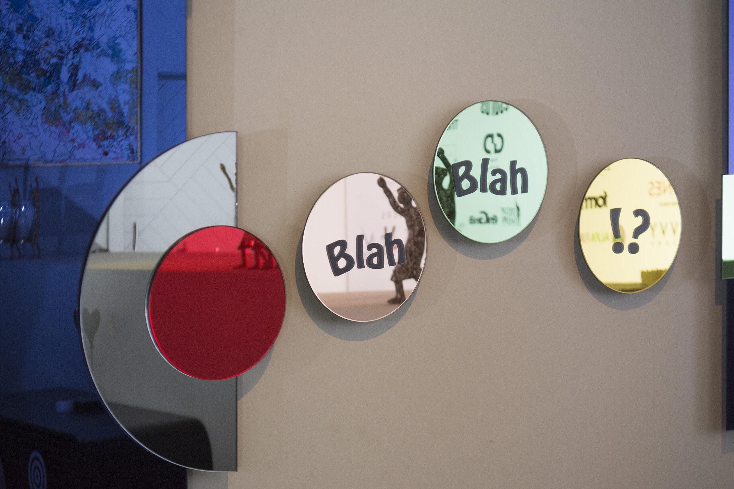 The “Bla Bla” Designed to amuse and encourage a reflection on our various ways of communicating, the Bla Bla mirror takes us into the vast arena of conversation. It embodies our arguments, sympathies, disagreements, or concurrences. It suggests that the way we converse, whether our words make sense or not, creates our relationships.