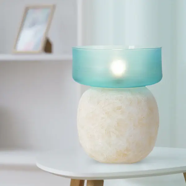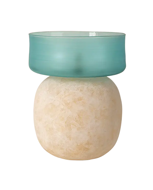 This ultimate minimalist design piece is perfect for cultivating that must-have geometric and minimalist look. The mushroom shaped design provides soft, ambient lighting suitable for any room.This is a handmade product using traditional handcrafting techniques and skills, made of Soft Alabaster base connected with transparent wire. And blue frosted glass chapeau. Material: Soft Alabaster & Glass Alabaster is an Ancient Egyptian fine-grained stone that has been used for centuries for carvings and other ornaments. It normally is snow-white and translucent.