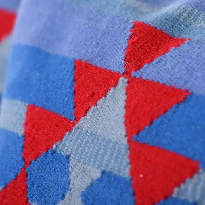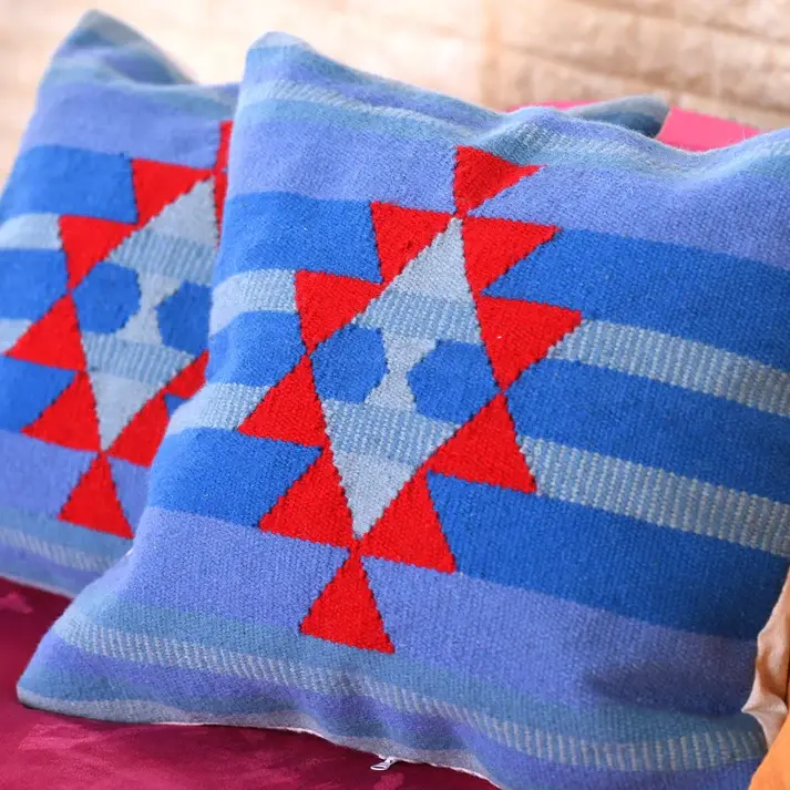 Cushion cover of handwoven natural wool, with a fabric back and an inner bag filled with fibre.