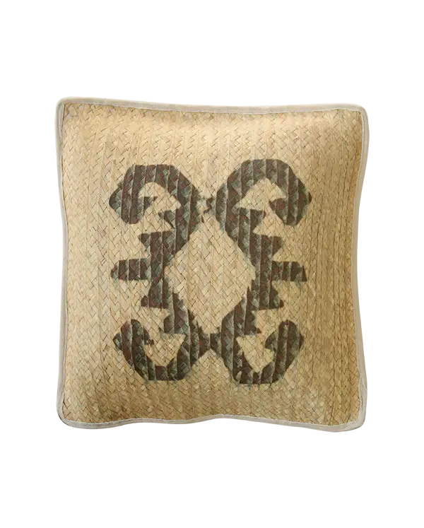 This delightful one-of-a-kind Khoos/wicker cushion with its artistic texture will complement any space with your eye-catching original designs. This unique natural handwoven Khoos cushion, made by skilled craftsmen, adds both personality and extra coziness to a chair or sofa. Design: pattern inspired by Sinai traditional art. Material: Printed handwoven khoos/wicker, with foam filling. Dimensions: 4545 cm Each khoos cushion is individually hand formed. Therefore, each is individually unique and has slight variations. Khoos is traditionally made of palm leaves; it is light yet sturdy. Origin: The ancient Egyptians, ever resourceful, were creating khoos furniture by around 3000 BC, using the bladed grasses so ubiquitous on the banks of the Nile and so strong when dried. These were used to produce some of the most beautiful intertwined furniture items the world has ever known.