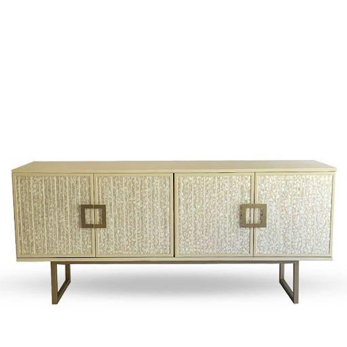 Wooden buffet with dimensions of 200 cm length × 50 cm width × 90 cm height. It features Stainless Steel legs, Stainless Steel handles, and a Wall Paper finish. The buffet has a central shelf.