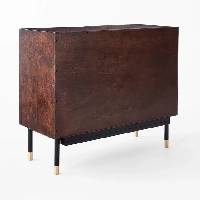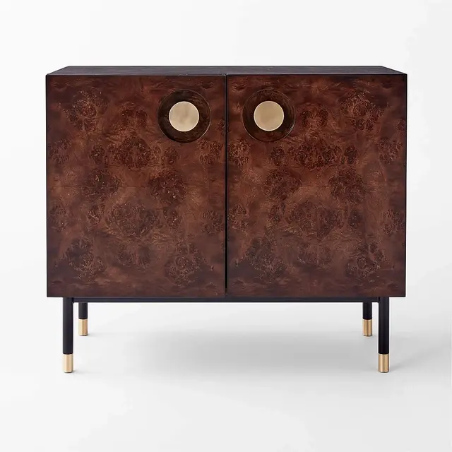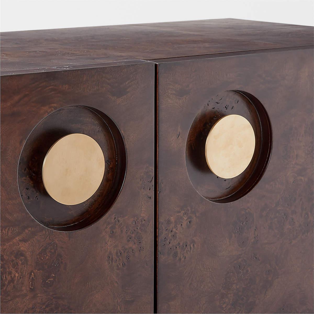 Modern entry cabinet by Barcelona-based Mermelada Estudio is informed by classic art deco design with its rich burl wood veneer, precisely diamond-matched for symmetry and a pleasing aesthetic. Satin black legs are capped with brass to match the circular brass pulls. Brass is unlacquered, offering a living finish with the patina of a vintage find.