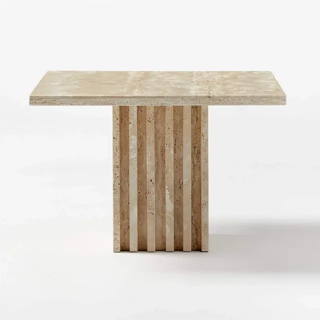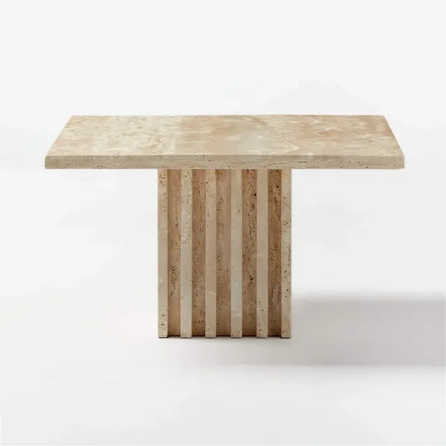 Cocktail table is made of pure, unpolished travertine and inspired by 1970s Italian modern designs, featuring an architectural silhouette, layered ivory tones and a style we're calling "soft brutalism." Fluted details on the base and variation in the natural travertine add to the coveted vintage feel.