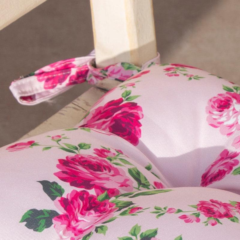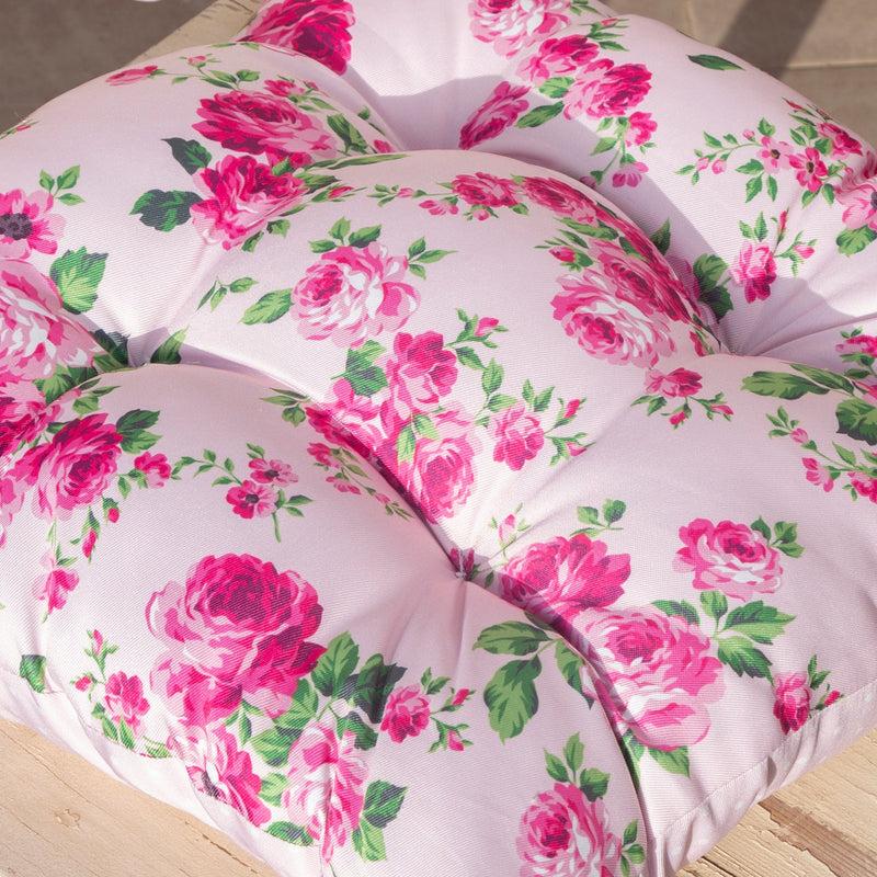 Comfy texture and colorful tones are just some of the things we love about our adorable seat cushions. This plush pad is durably constructed with cotton fiber, outdoor fabric, and ties at two of the corners to make it easy to attach to your chair.