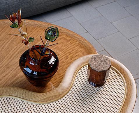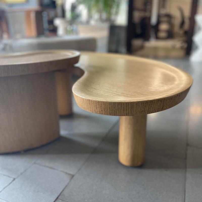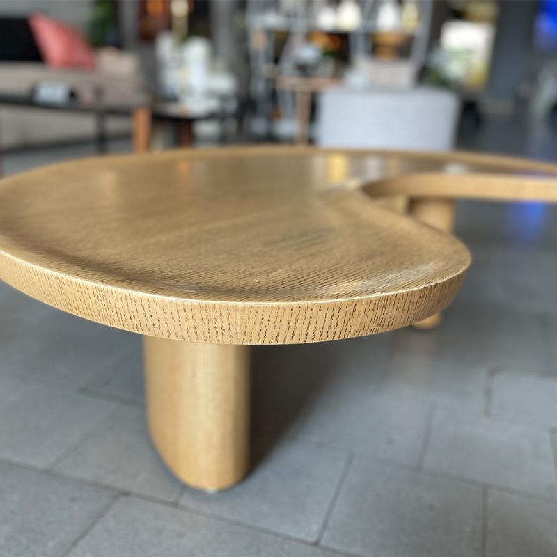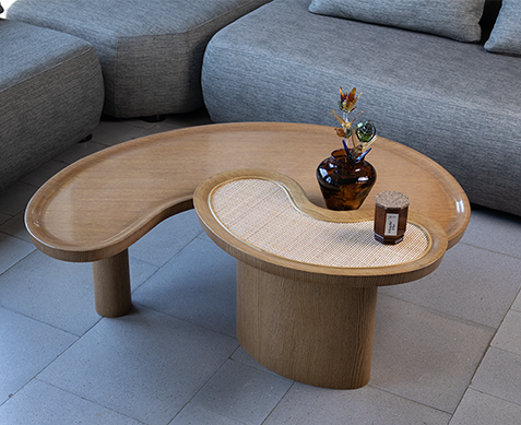 Two overlapping coffee tables made of plywood, oak wood, and cane. It is inspired by the multifoil arches executed in an organic raw shape.