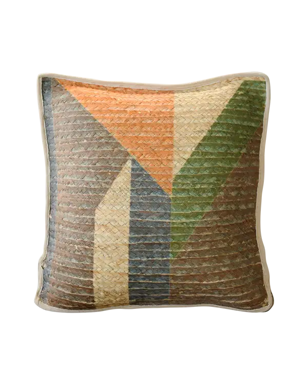 This delightful one-of-a-kind Khoos/wicker cushion with its artistic texture will complement any space with your eye-catching original designs. This unique natural handwoven Khoos cushion, made by skilled craftsmen, adds both personality and extra coziness to chair or sofa. Design: geometric pattern inspired by Nile feluccas.