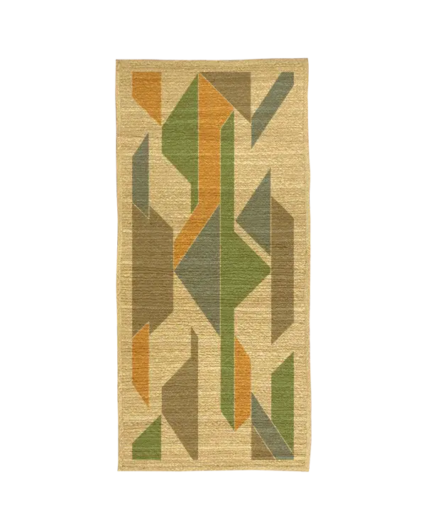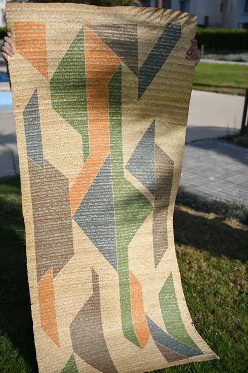 This delightful one-of-a-kind Khoos / wicker rug with its artistic texture will complement any space with your eye-catching original designs. This unique natural handwoven Khoos rug, made by skilled craftsmen, adds both personality and extra coziness to any space. Design: geometric pattern inspired by Nile feluccas. Material: Printed handwoven khoos/wicker. Dimensions: 180 cm