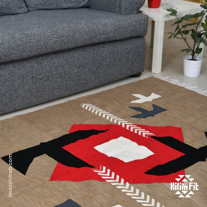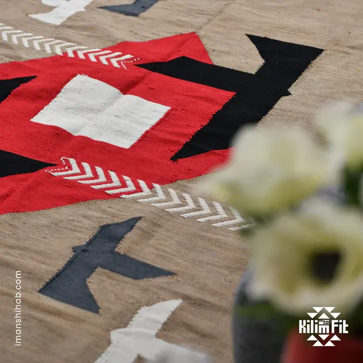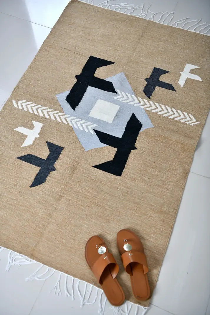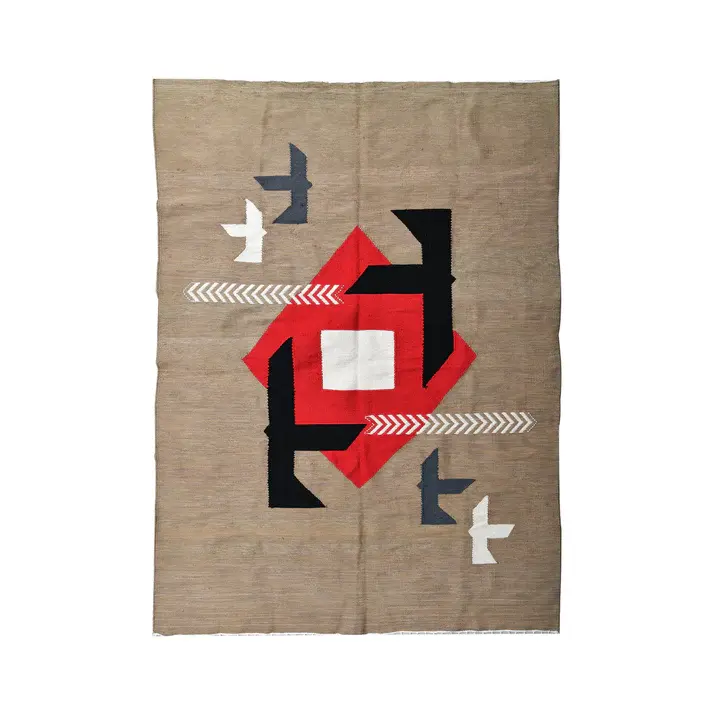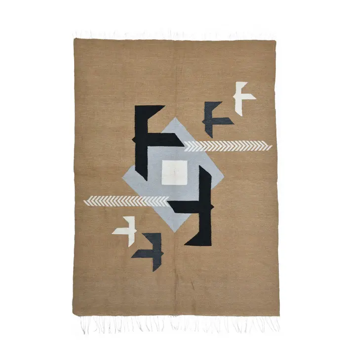 Handcrafted cotton kilim, flat-woven on a cotton base with the prominent effect of 'Soumak' weaving technique. A piece with a peaceful message. Inspired by the dove of peace message, an abstract motif of flying birds along with the prominent effect of the weaving were used to depict the wheat leaves that doves carried in their legs as a symbol of concord invitation.