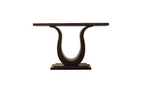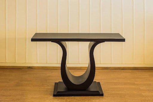 Natural wood console table with dimensions of 140 cm length × 40 cm width × 80 cm height. It features a Polyester paint finish and a Walnut veneer top.