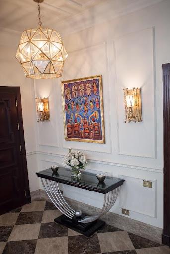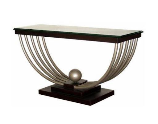 Console table with an Iron base, metal top with an Aru veneer, and a Silver Leaf finish. It has dimensions of 150 cm length × 45 cm width × 80 cm height. It features a Polyester paint finish and Silver Leaf paper decoration.