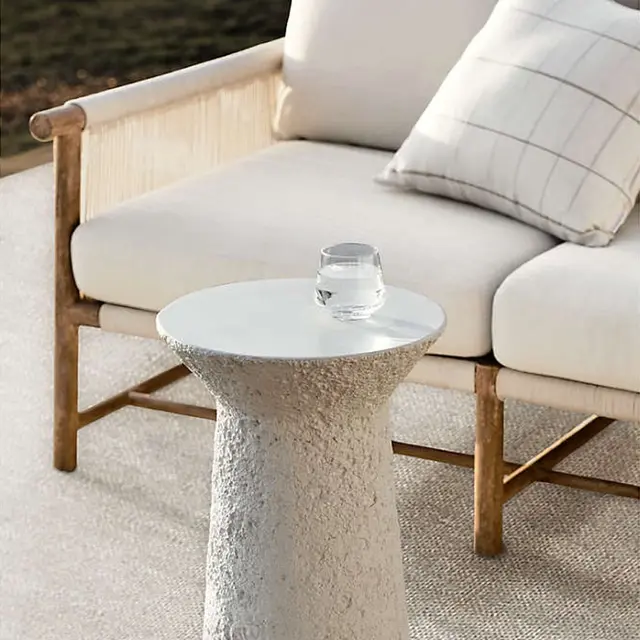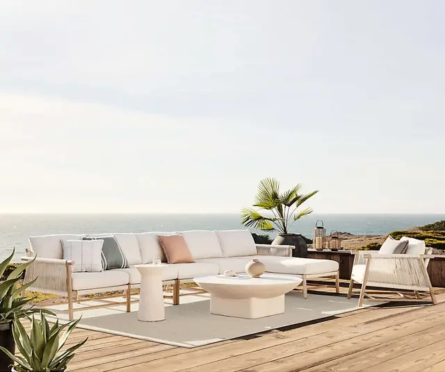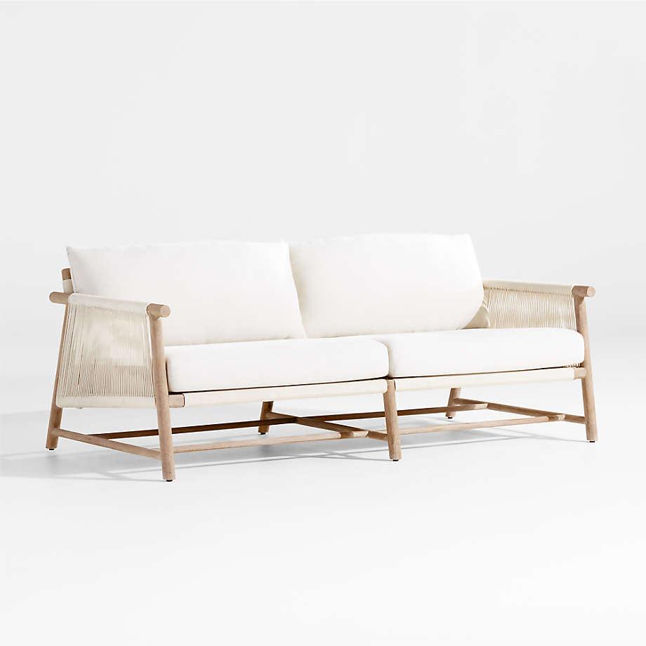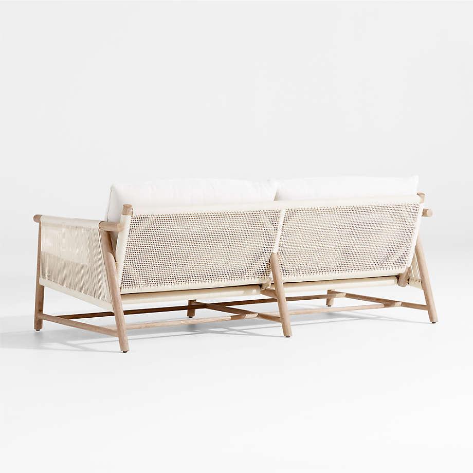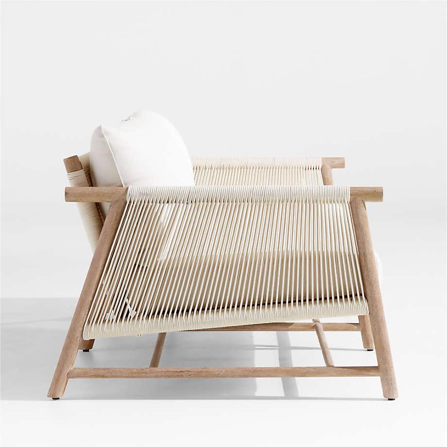 As cool and coastal as an ocean breeze, Fen brings effortless style to outdoor lounging. Round dowels of natural teak craft the sofa's clean-lined frame, highlighted with wirebrushing and a warm ceruse finish. Each frame is hand-wrapped individually by skilled artisans with an outdoor-rated cord that looks and feels like natural rope. Adding eye-catching texture and a tonal complement, the ivory-colored cord wraps striking linear accents on the arms and a basketweave foundation for the bench seat cushion and pillow backs covered in an off-white, outdoor-rated fabric. Designed with a medium-firm seat and soft back, the outdoor sofa is right at home in both casual and more formal outdoor settings.