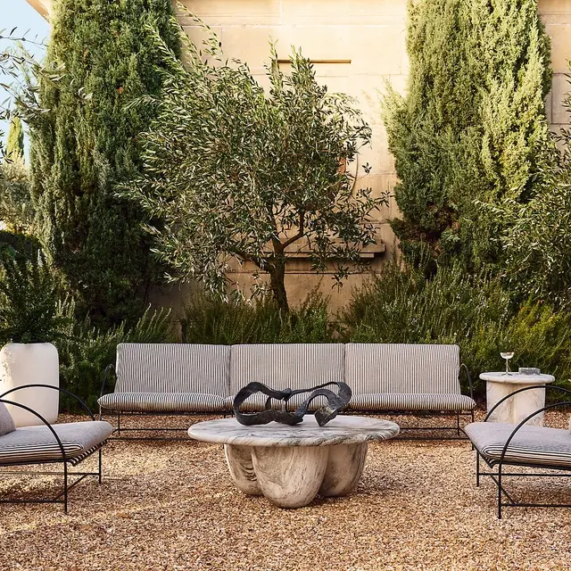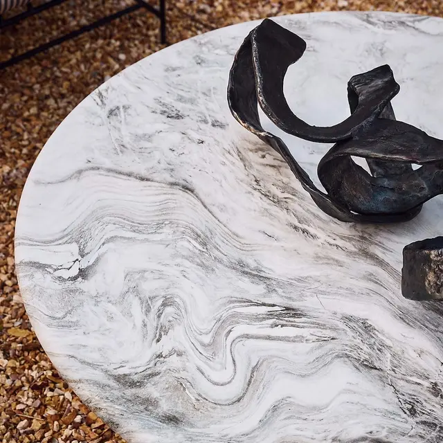 From all angles, the outdoor coffee table by French designer Sam Baron wears unapologetically bold curves. Its marbled finish is created by dipping a printed film in water, then dipping the cast resin in the tub. When removed, the table retains a unique design; due to this artistic process, no two pieces will be identical.