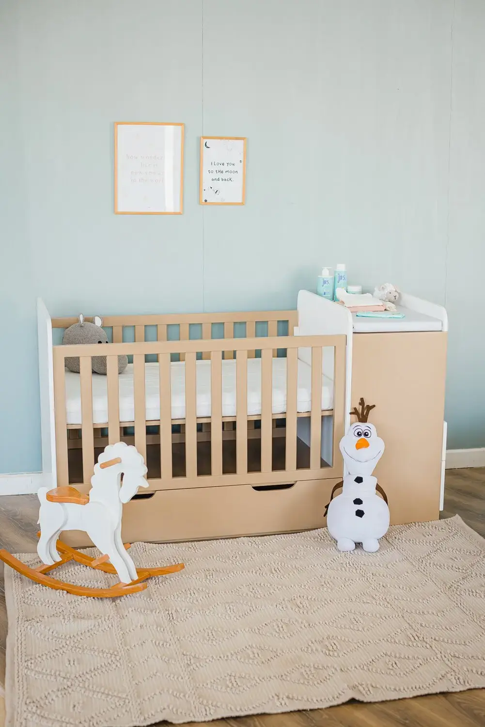 Crafted with love and designed for ultimate comfort, our Cozy Nook Crib cradles your little one in a haven of serenity. Imagine a soft, breathable mattress gently hugging your baby as they drift off to sleep, just like being nestled safely in a mama panda's embrace. And for added convenience, we've included an attached chest of drawers with a changing unit on top. This thoughtful addition ensures that everything you need for those precious moments with your baby is always within arm's reach.
