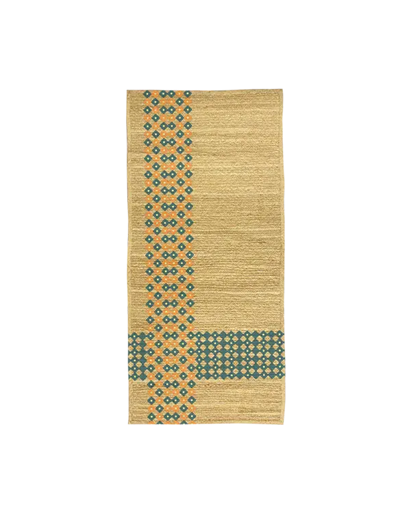 This delightful one-of-a-kind Khoos / wicker rug with its artistic texture will complement any space with your eye-catching original designs. This unique natural handwoven Khoos rug made by skilled craftsmen, adds both personality and extra coziness to any space. Design: geometric pattern inspired from traditional Sinai art. Material: Printed handwoven khoos/wicker.
