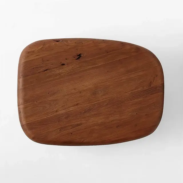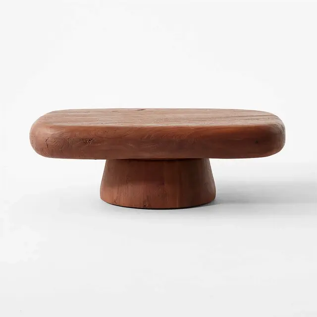 Defined by softly rounded edges and a pedestal base, carved wood coffee table by Caleb Zipperer makes a striking statement with its bold proportions. Crafted of solid acacia wood, the table is wirebrushed and stained to a matte walnut finish to highlight the wood's organic texture and rich grain pattern.