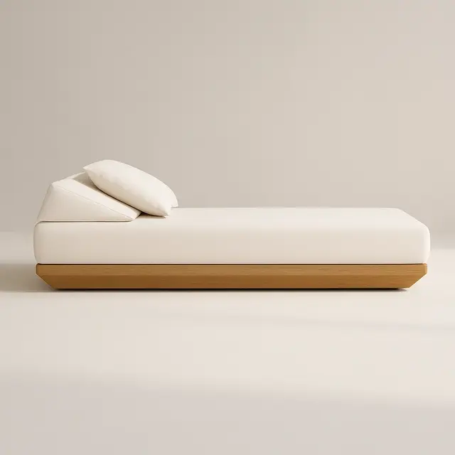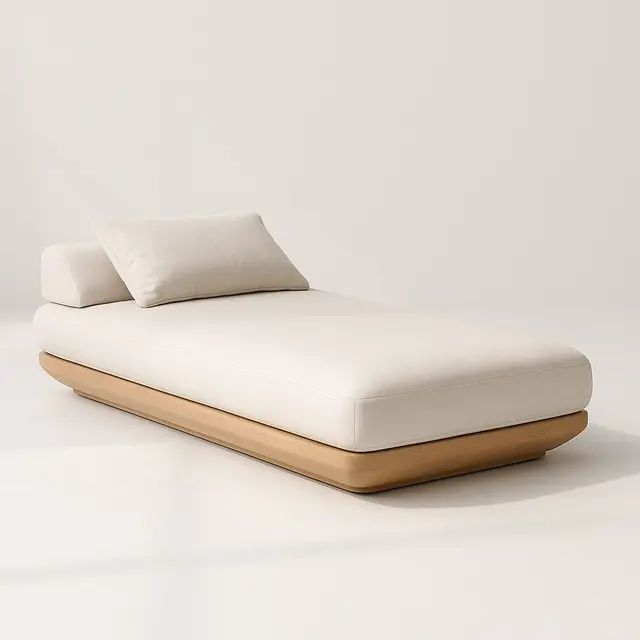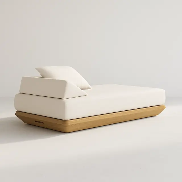 The chaise features soft, tailored upholstery with a distinctive teak base reminiscent of a ship’s hull. The chaise has wheels and a handle for easy moving. Chaise is fixed, therefore back does not raise up or down. Weighted triangular pillow can be flipped for different sitting heights. Available in Natural, Weathered, Clear Sealer, and Yacht.