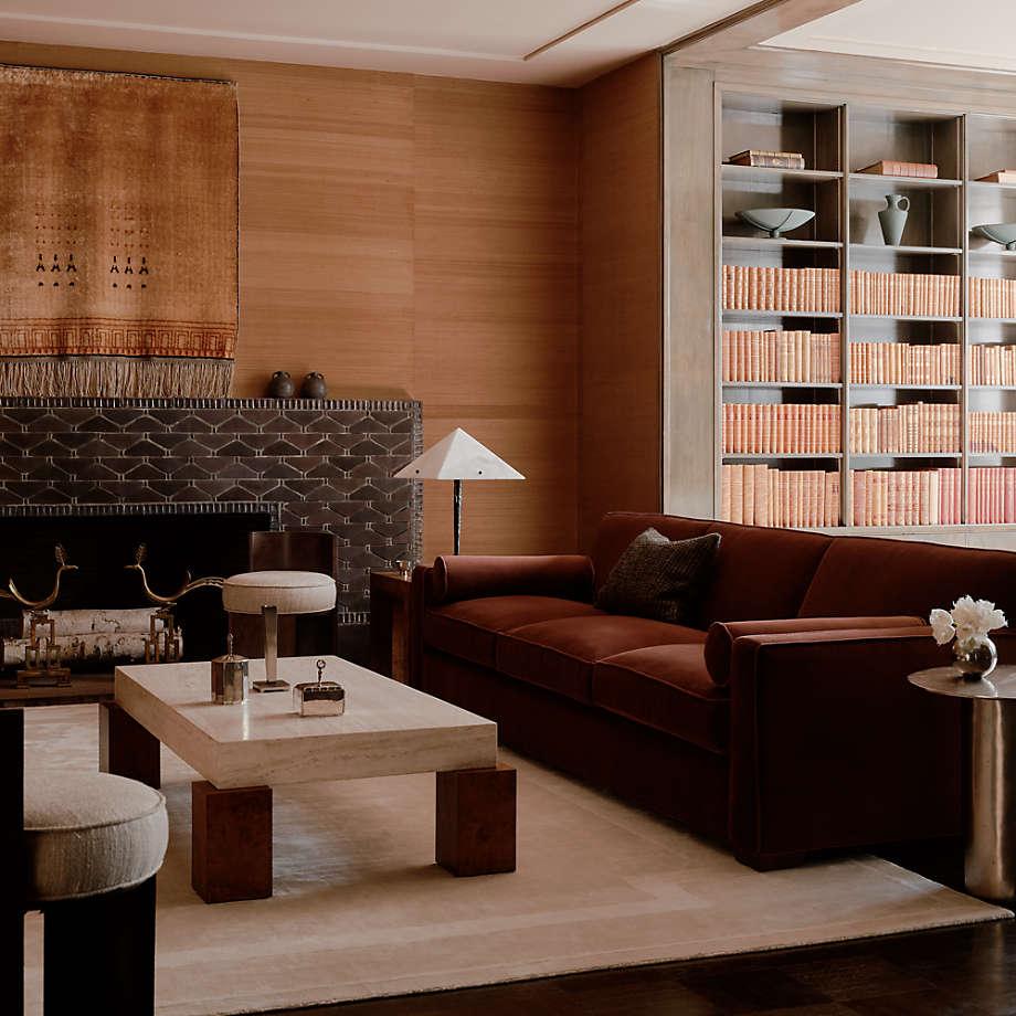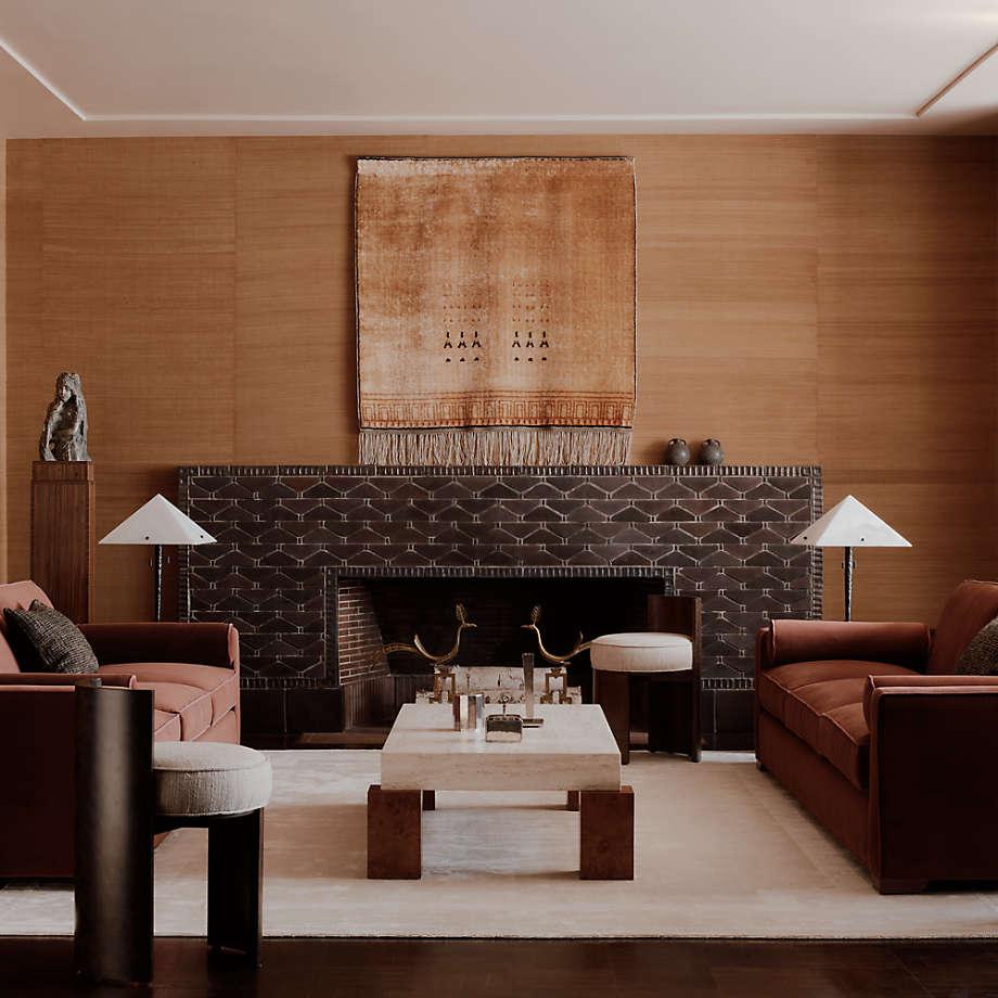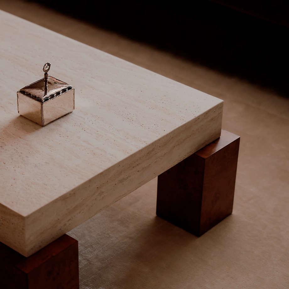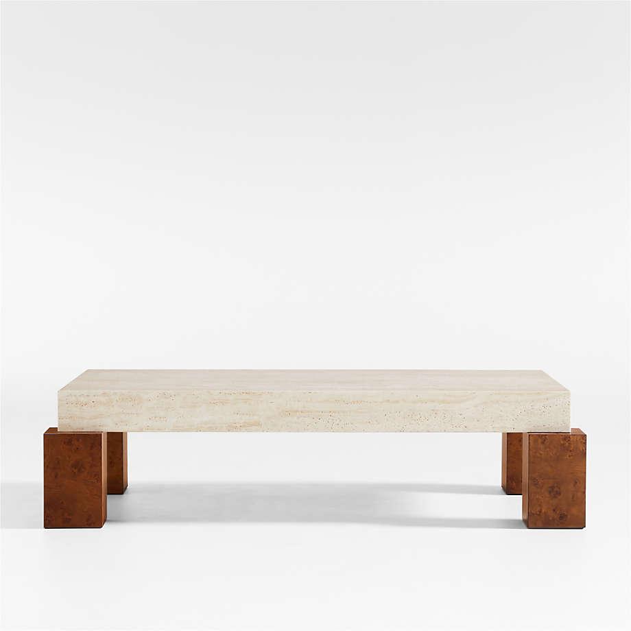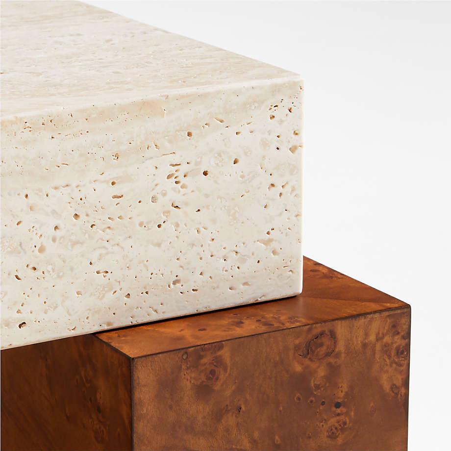 Translating the geometric forms of 1930s design into modern minimalism, Dualité juxtaposes stone and wood in this striking coffee table. Block legs offer broad planes to showcase the fascinating whorls of mappa burl veneer. A thick slab of travertine forms the top, offset on the legs for a dynamic sense of balance. We love the interplay of texture and color between the stone's ivory hue and natural veining and the wood's rich brown stain and vibrant wood grain.