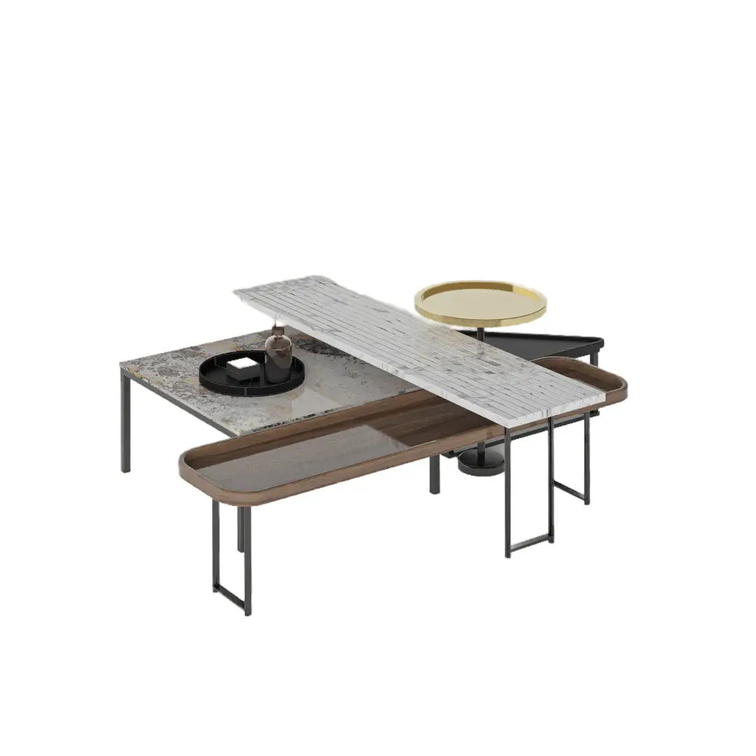 It is a designed dynamic geometric collection of round, rectangular, triangular and square coffee tables arranged in different heights and sizes that provide the perfect balance between rigid and smooth structure in an aesthetically pleasing form.