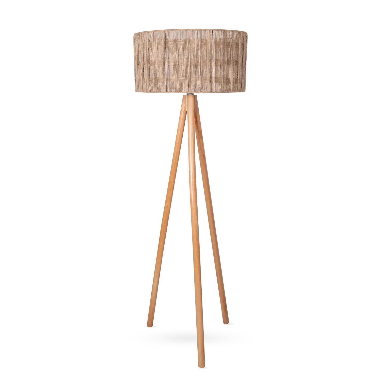 A wooden tripod lamp with a Jute shade! This exquisite lighting fixture brings together the beauty of wood and the softness of a Jute shade, adding a touch of sophistication to your home decor.
