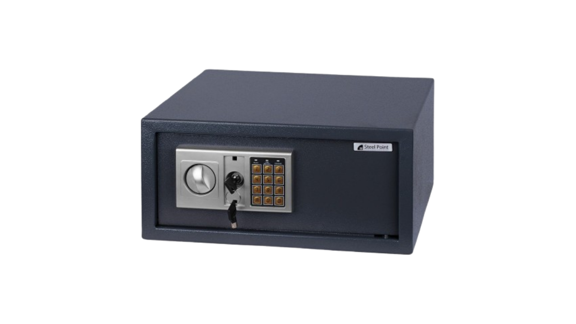 • cubic-foot security safe with electronic lock and 2 emergency override keys
