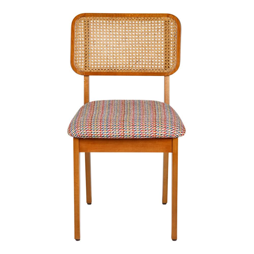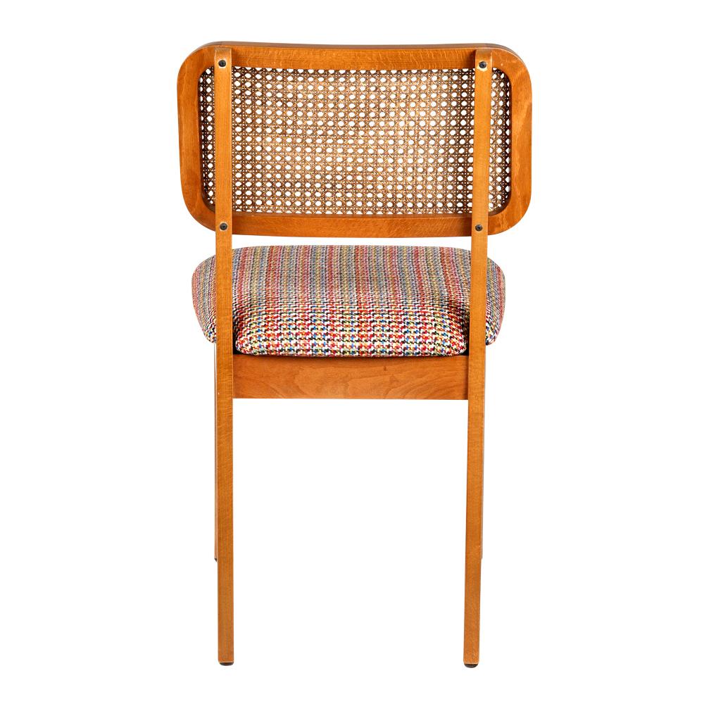 Dress up your dining table or brighten up your corner with Ela. It comes in this retro multicolor fabric choice, and in black or brown genuine leather.