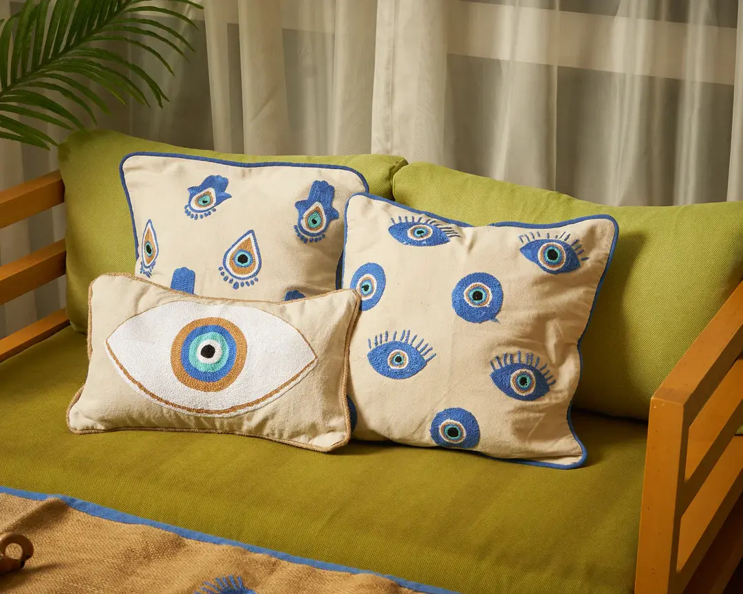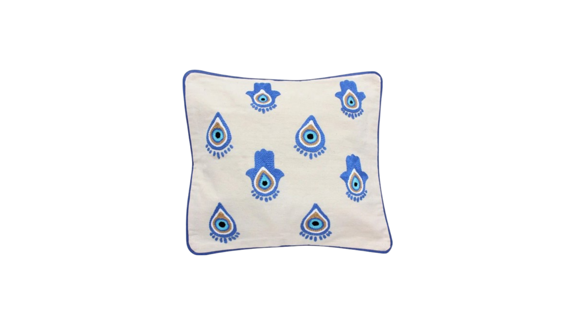 Elevate Your Comfort: Hand Weaved KAF & Eyes Cushion in blue