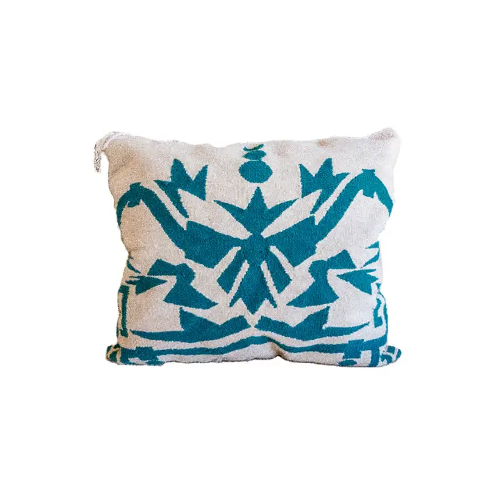 Cushion cover of handwoven natural wool, with a fabric back and an inner bag filled with fibre.