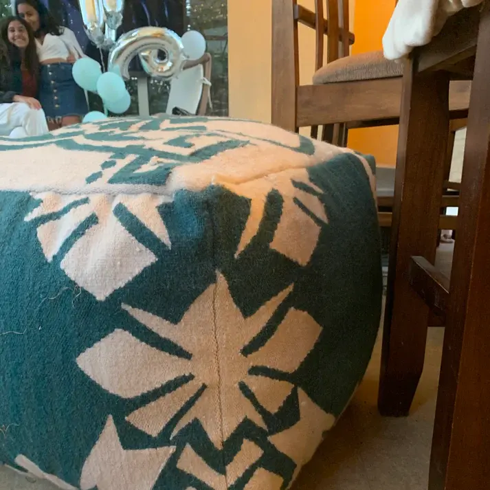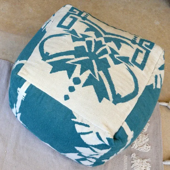 A handwoven wool kilim exterior with a fabric base easy to open to an internal bag filled with fiber beans.
