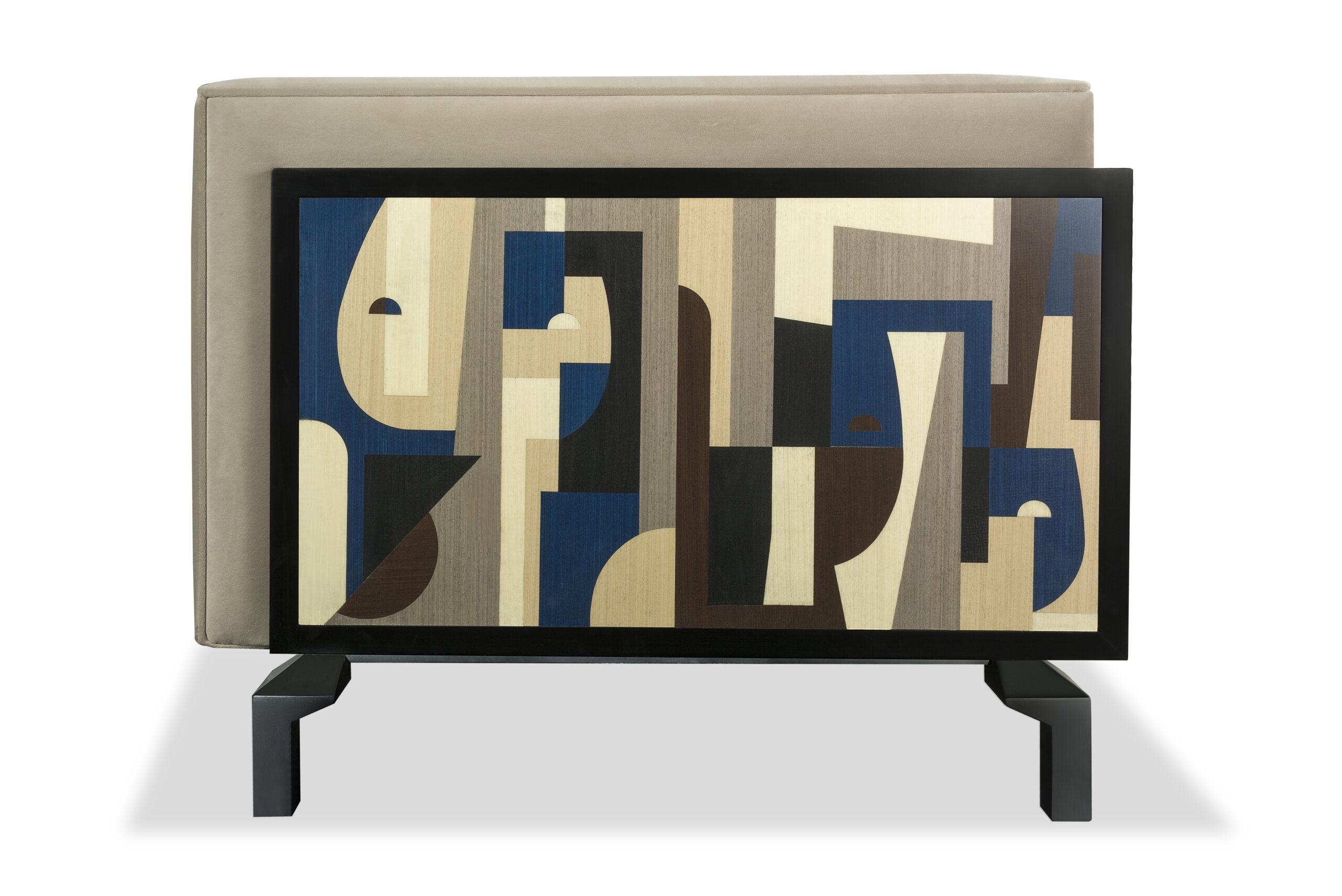 Black Lacquered Wood, Multicolor Artificial Wood Veneers and Velvet Fabric