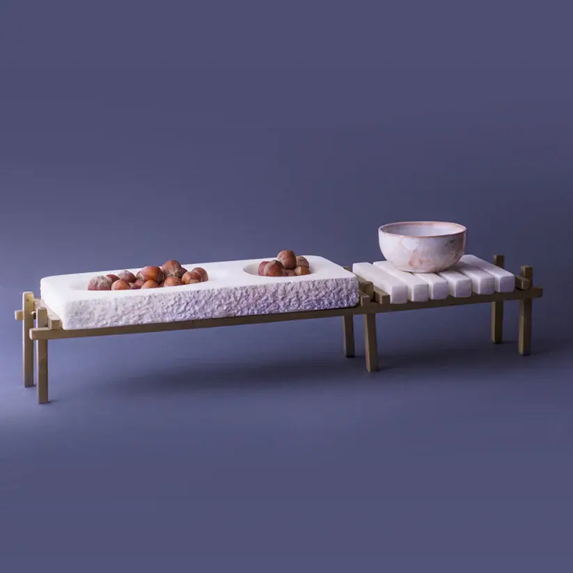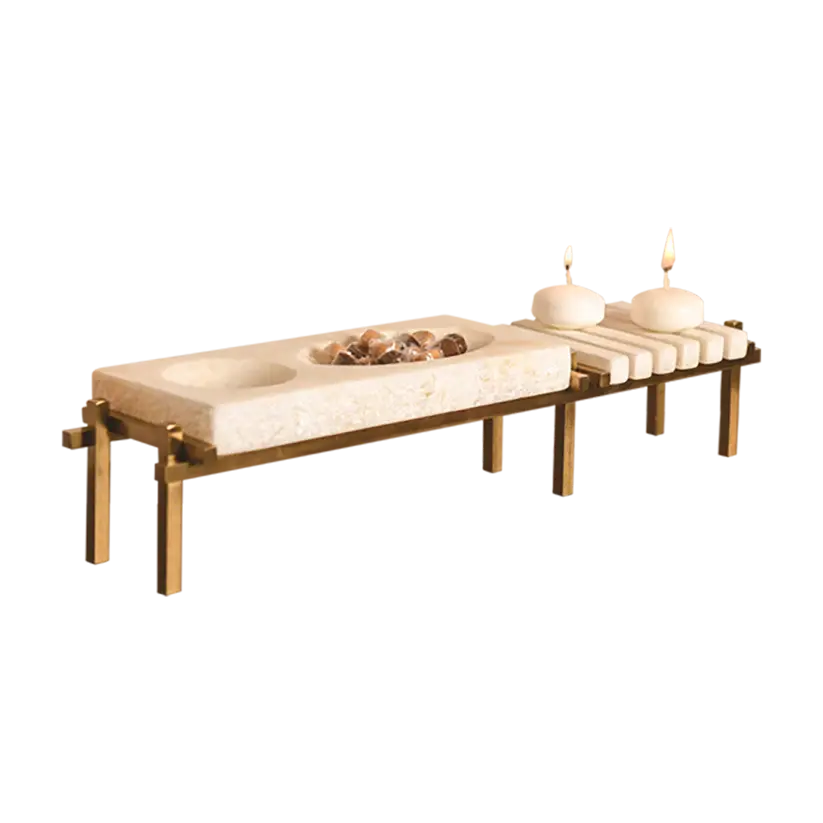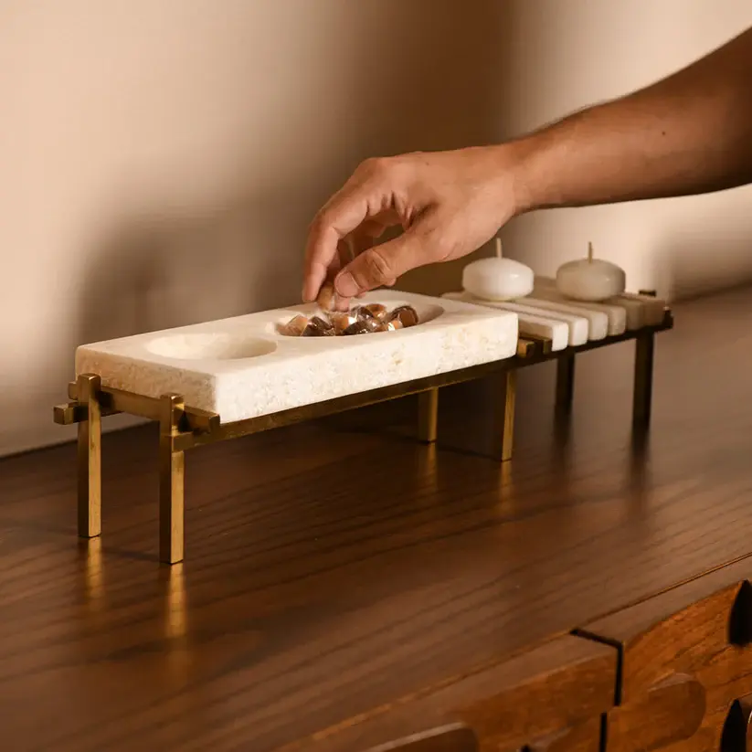 Fusion tableware is a unique mix of Egyptian and Japanese art and a mix of 2 different materials. Looking for a stylish and creative way to add essence to your room? Look no further than this beautiful Japanese-inspired table art decor! Made of Alabaster and Brass plated stainless steel, it adds a unique mix of Egyptian and Southeast Asian flair to any room that makes a statement in any space. It is perfect for your favorite nuts and holiday treats or candles. Ideal for home & office decor. Very stylish minimalistic designs attract everyone's attention and add unusual taste and show individuality. A great gift choice for family or friends. This is a handmade product using traditional handcrafting techniques and skills; variations may therefore occur. Material: solid holders of gold-plated stainless steel Alabaster is an Ancient Egyptian fine-grained stone that has been used for centuries for carvings and other ornaments. It normally is snow-white and translucent.