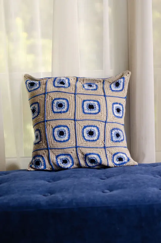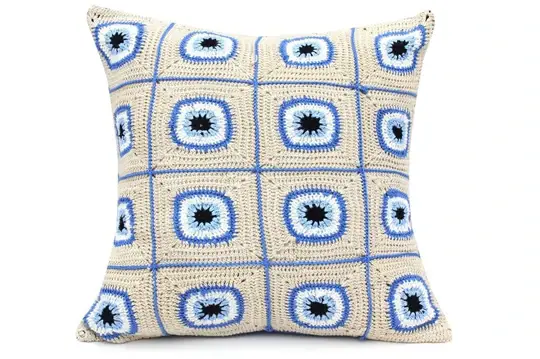 Gaze into Serenity: Crochet Cushion with Blue Eyes