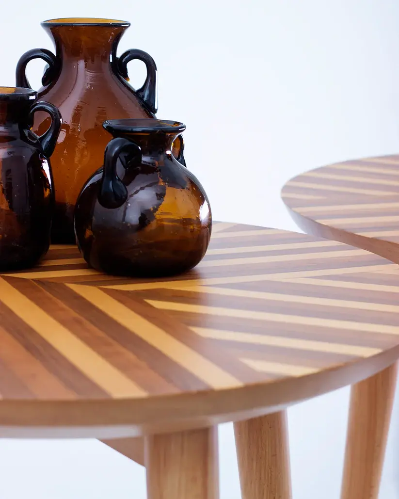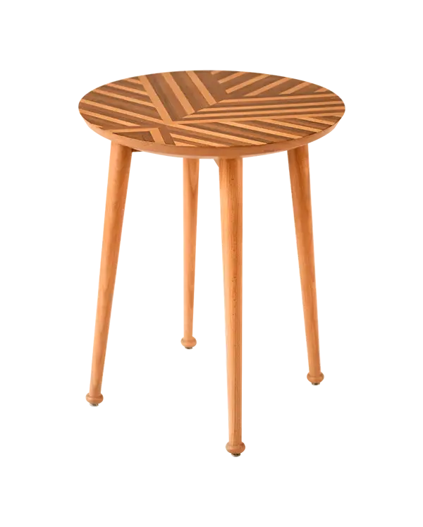 Approach to a marriage of Islamic geometric drawings and the French technique—marquetry—birthing a strikingly unique piece of art. This collection aims to create an elegant & sleek design, not distracting from nature’s infinite variation, showcasing the use of real wood. Our simple, elegant Geo Round side table is beautifully handcrafted from 3 types of wooden veneers; Cherry, Walnut, & Sycamore. Geo Round side table changes the atmosphere of the environment with its natural appearance. It activates our sense of touch with its natural beauty. Its simple yet catchy design adds a lot to your corner. Its texture is smooth and silky matte.