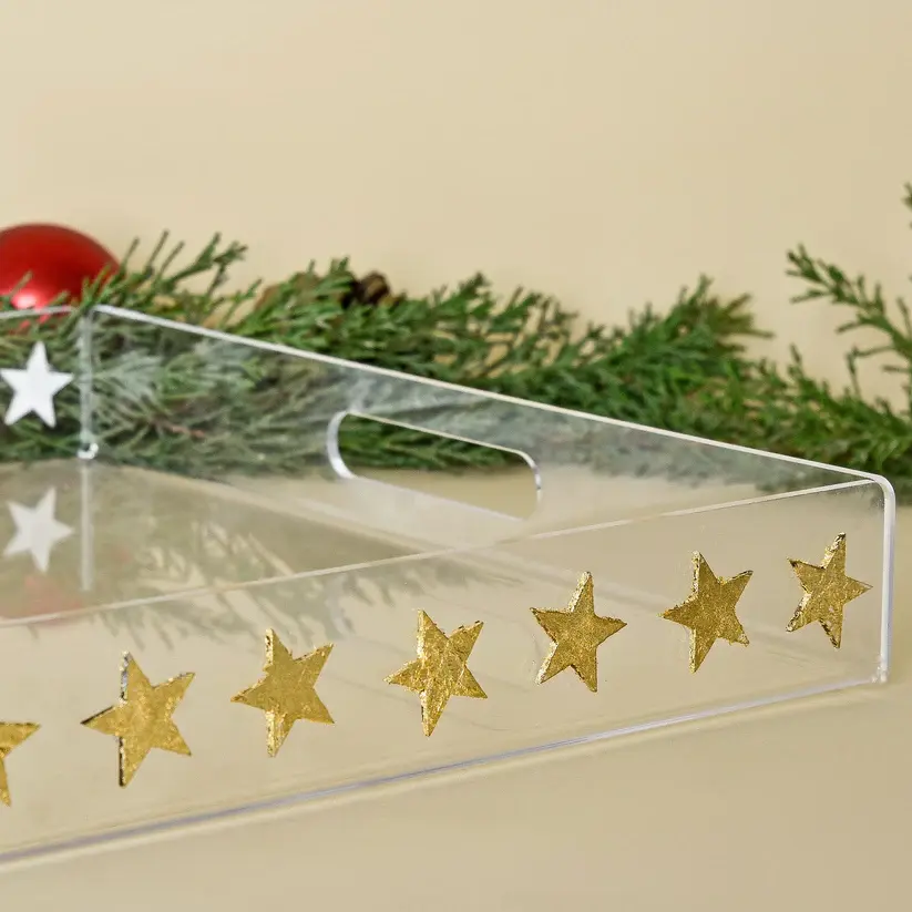 Acrylic serving tray 30×30 cm featuring hand-painted gold Christmas star motifs — a festive and elegant piece perfect for serving, decorating, or gifting during the holiday season.