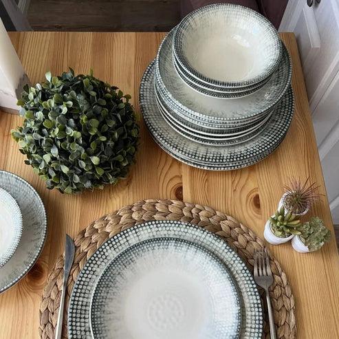 This dinner set includes 24 round porcelain plates, made in Turkey with durable materials and a stylish mint green finish. The easy-to-handle plates are also microwave and dishwasher safe, making them easy to clean and reuse. All purchases come with free returns and replacements, so you can shop with confidence.