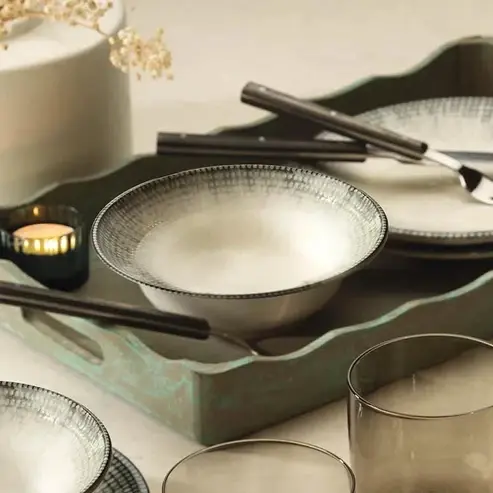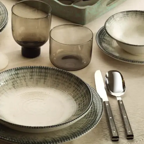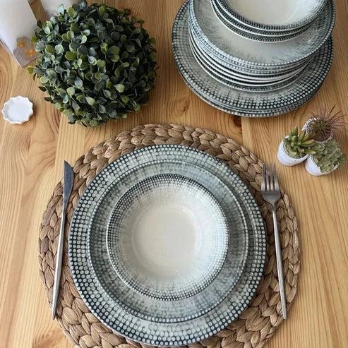 This dinner set includes 24 round porcelain plates, made in Turkey with durable materials and a stylish mint green finish. The easy-to-handle plates are also microwave and dishwasher safe, making them easy to clean and reuse. All purchases come with free returns and replacements, so you can shop with confidence.