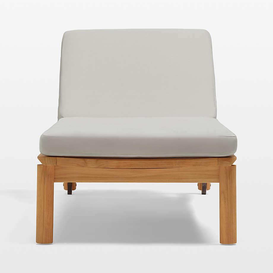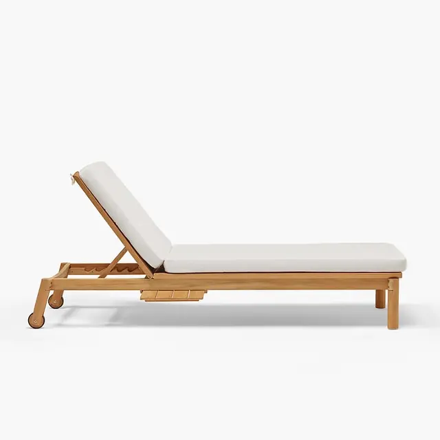 Angled at a slight recline, the chaise lounge invites you to kick back and enjoy the great outdoors. Natural teak shapes the chaise's chunky, rounded frame that features an adjustable back with five reclining positions and a side table surface that slides out on either side. The cushion adds a layer of comfort in a light neutral shade, and wheels make it easy to move the chaise into sun or shade. Offering living-room looks with surprising durability, the outdoor chaise lounge withstands the elements in weather-resistant teak with a fast-drying foam cushion.