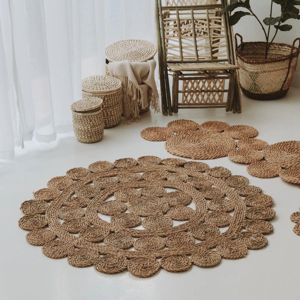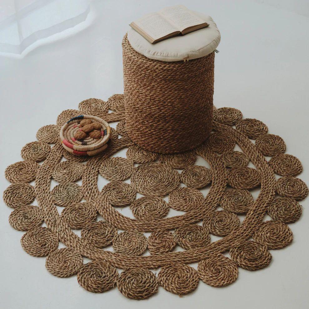 This beautifully designed rug features intricate patterns made from high-quality halfa, showcasing the skilled craftsmanship of our artisans. Its earthy tones and unique circular design make it a perfect addition to any living room, bedroom, or entryway, providing a warm and inviting atmosphere.